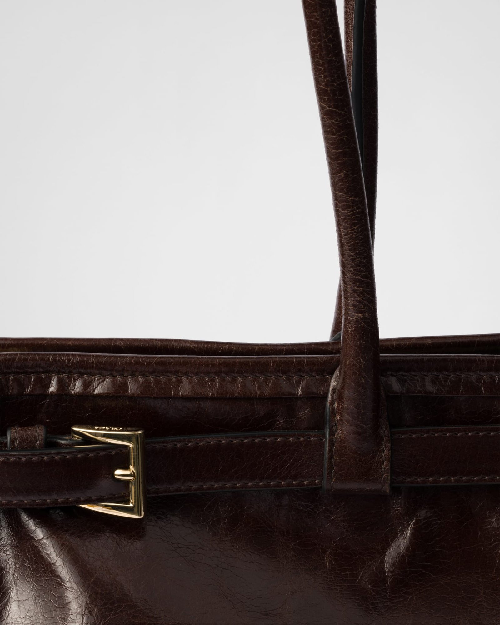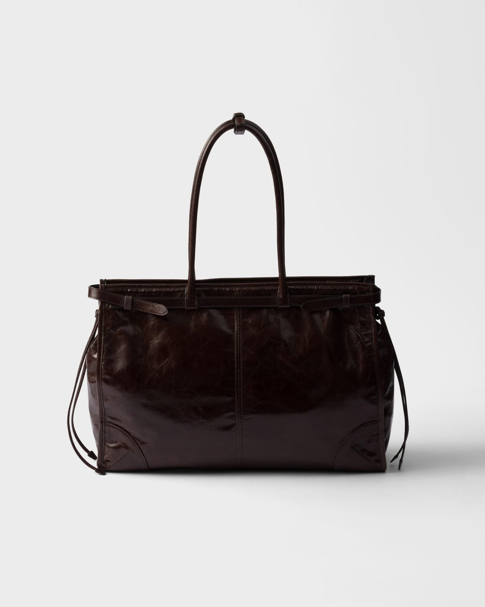 A pragmatic but refined design defines this handbag made of soft leather with a shiny finish that emphasizes its modern, versatile allure. The clean-lined silhouette blends different influences into one style with a sleek, distinctive aesthetic. Embellished by the sophisticated detail of narrow straps, the roomy bag has an interior equipped with zipper pockets. The enameled metal triangle logo completes the look with its iconic signature.